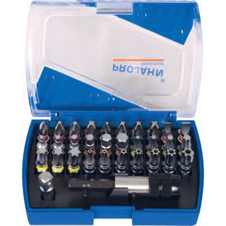 1/4" Color-Bit-Box- 32 dílů v praktickém boxu- zaklapávací pásková spona 2 - ploché (červená) 4 - 5 mm4 + Phillips (tmavě červená) PH 1 - 2 - 2 - 34 + Pozidriv (modrá) PZ 1 - 2 - 2 - 37 * Torx (žlutá) T10 - 15 - 20 - 25 - 27 - 30 - 407 * Torx s vývrtem (fialová) T10 - 15 - 20 - 25 - 27 - 30 - 406 Inbus (oranžová) 2 - 2,5 - 3 - 4 - 5 - 6 mm1 Adapter bit-nástrč.hlavice 1/4" x 1/4", 25 mm1 držák bitů s rychloupínáním 60 mm