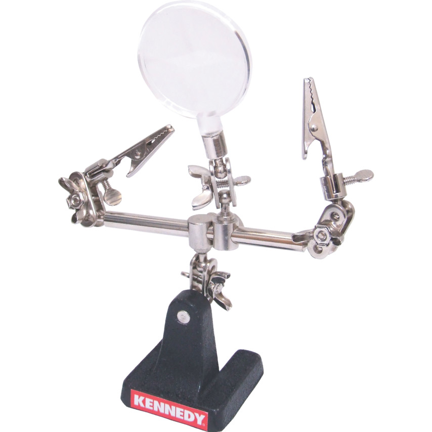 ržák pomocný KENNEDY pro přesné pájení, zapojování a výrobu modelů. Má 10 kloubů pro univerzální nastavení. Zrcadlo o průměru 50 mm se zvětšením 2.5x. Dvě krokosvorky mohou držet předměty o tloušťce do 8 mm. Robustní litinová základna zajišťuje stabilitu. Všechny ostatní kovové části jsou chromované a odolné proti korozi.