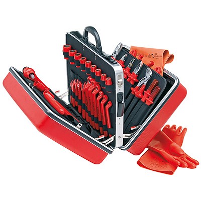 - Odolné provedení z červeného materiálu ABS; vybaveno sortimentem nářadí KNIPEX pro práce na elektrických zařízeních, testovaným podle DIN EN/IEC 60900, a rovněž sadou doplňkových ochranných krytů, svorek a rukavic