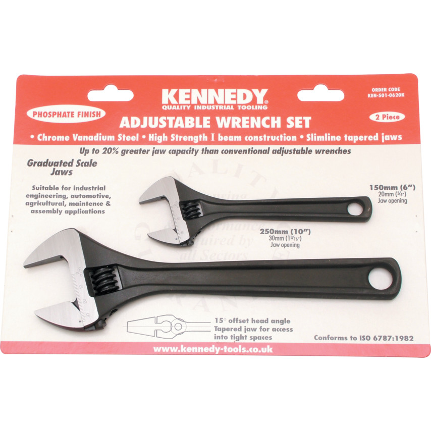 Klíč stavitelný sada KENNEDY 150/250 s fosfátovým povrchem je vyroben z pevných “I” profilů, tepelně zpracovány pro prodloužení životnosti a následně chromovány nebo fosfátovány pro zvýšení pevnosti. Leštěný antikorozní chromovaný povrch. Úhel vyosení hlavy 15 stupňů. Zúžené čelisti pro lepší přístup do špatně dostupných prostorů. Rovnoběžné čelisti s plynulým nastavením a samosvorná konstrukce zabraňují neočekávanému otevření čelistí i při plném zatížení. Tyto stavitelné klíče jsou vhodné pro aplikace ve strojírenství, automobilovém průmyslu, zemědělství a při údržbě či opravách.