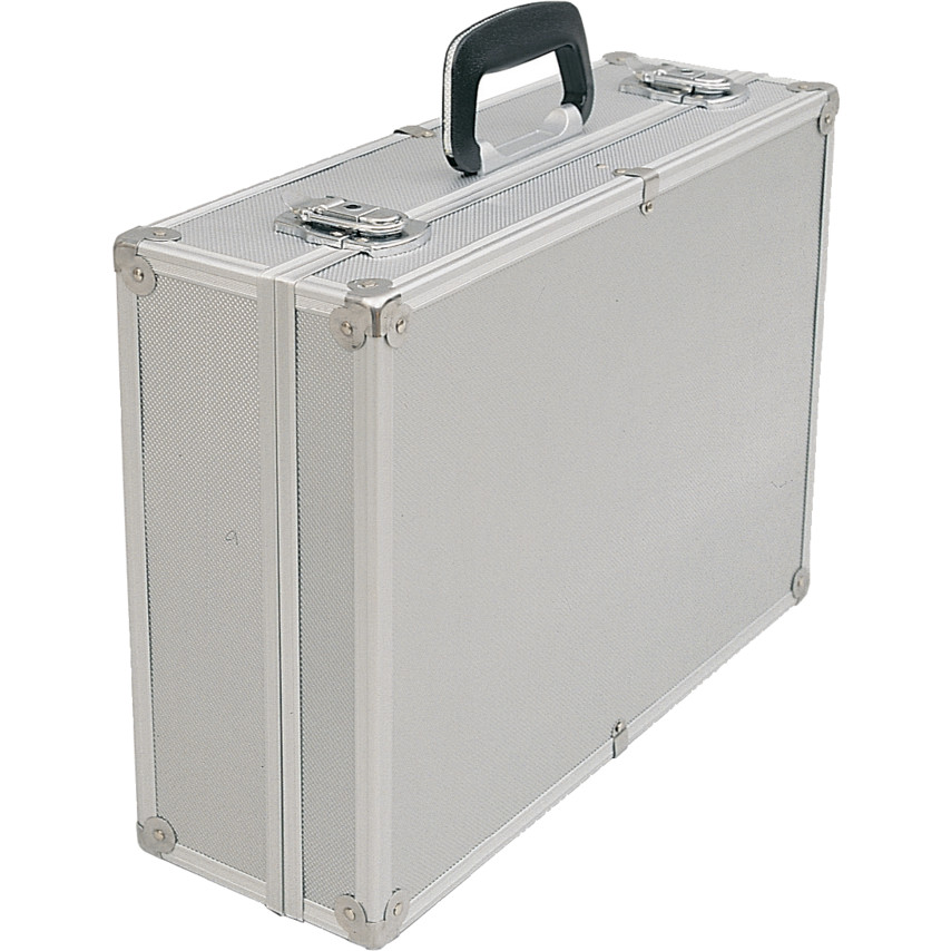 - Stříbrný hliníkový kufr s vyztuženými hranami a rohy
