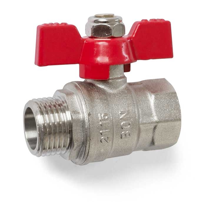 Kulový ventil s vnitřním závitem 1/2" a vnějším závitem 1/2". Tělo z poniklované mosazi, kulička z tvrdě pochromované mosazi a teflonové těsnění kuličky.