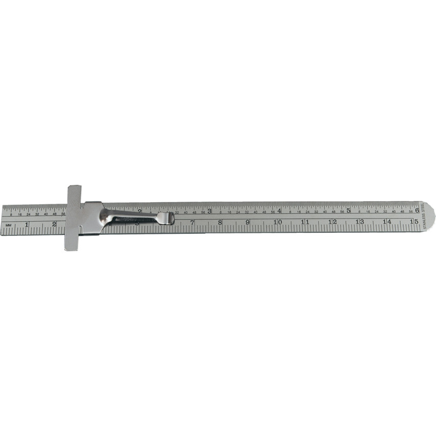 Listy z temperované pružinové nerezové oceli. List o šířce 13mm s klipsem na uchycení na kapse a posuvným hloubkoměrem. Na zadní straně je převodní tabulka z palcových jednotek na milimetry s krokem 1/64”. Šířka listu 12mm. Lze je také použít jako hloubkoměr