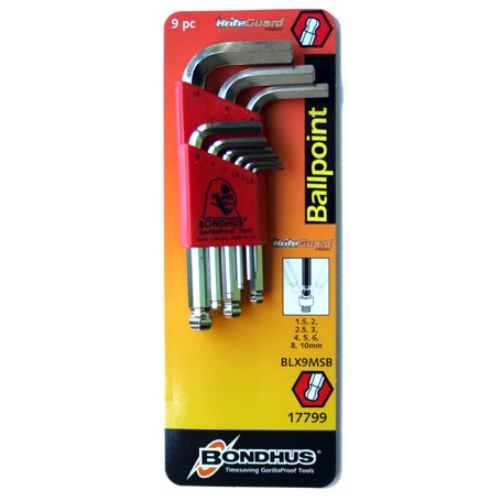Sada imbusových L-klíčů s kuličkou - zkrácená Rozměry:1,5mm, 2mm, 2,5mm, 3mm, 4mm, 5mm, 6mm, 8mm, 10mmPovrchová úprava Brite GuardKlíče jsou vyrobeny z oceli Protanium, která je až o 20% pevnější než běžné druhy oceli. Kulové zakončení imbusových L-klíčů značky BONDHUS umožňuje práci pod úhlem až 25 stupňů. Sada je opatřena pouzdrem Bondhex. Každý klíč a pole sady je označeno rozměrem, což umožňuje rychlé, pevné a bezpečné uložení každého klíče. Klíče jsou v pouzdru uzamčeny pootočením, což brání jejich uvolnění. Pouzdro lze použít i při šroubování ke zvětšení páky.