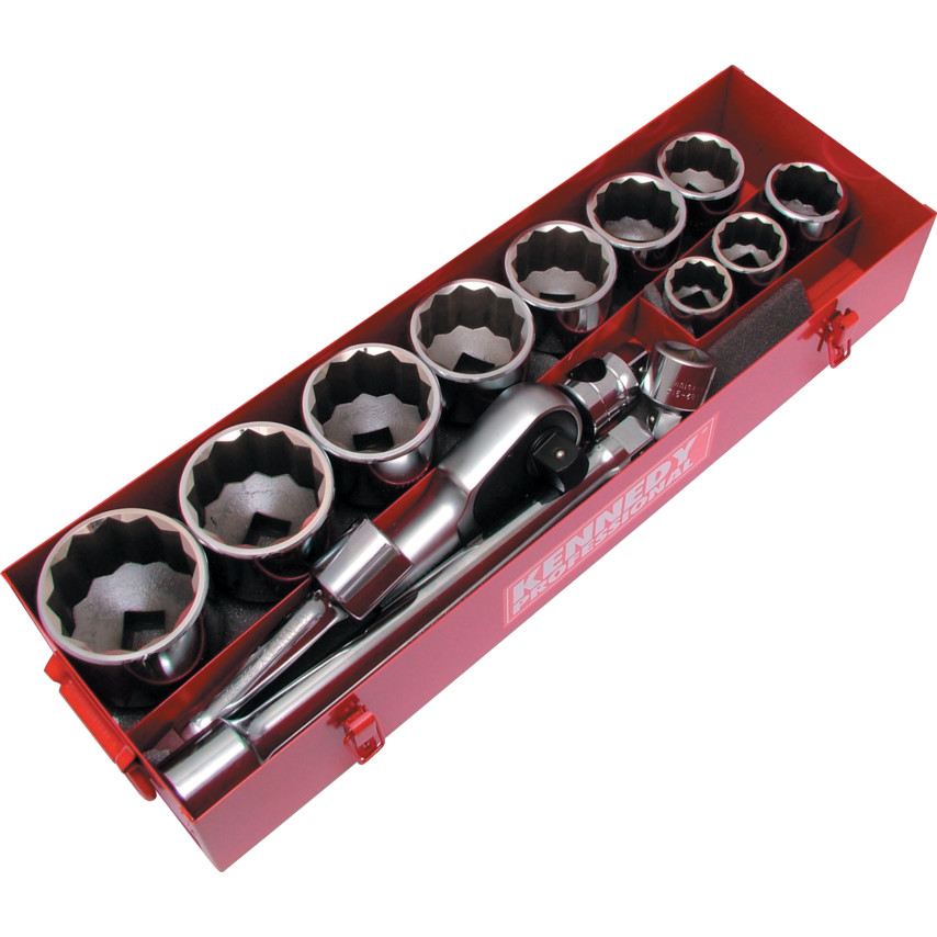 Obsah sady: Hlavice 12-hranné: 36, 41, 46, 50, 55, 60, 65, 70, 75, a 80 mm.