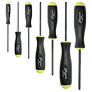 Sada šroubováků s kuličkou, standartníRozměry: 5/64", 3/32",7/64", 1/8", 9/64", 5/32", 3/16"Komfortní rukojeť umožňuje přenos kroutícího momentu. Provedení je velmi odolné proti vyklouznutí ze šroubu. Čepel je vyrobena z oceli Protanium, která je až o 20% pevnější než běžné druhy oceli.