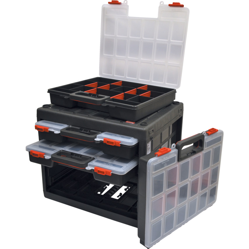 Zásobníky mají průhledná víka k usnadnění výběru a vícepolohové dělicí přepážky.