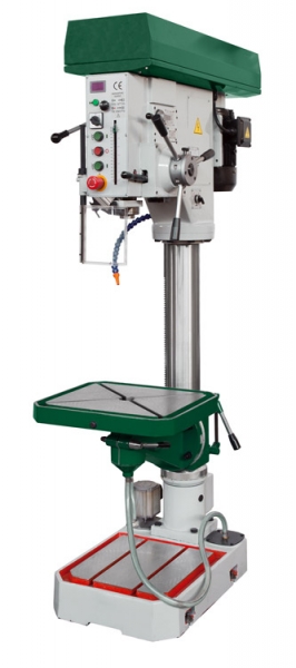 Masivní sloupová vrtačka s plynulou regulací otáček.