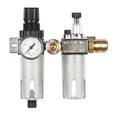 Obsahuje regulátor tlaku s filtrem s manuálním odváděním kondenzátu, manometr, olejový přimazávač a 2 rychlospojky.