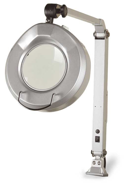 Pracovní světlo s kruhovou zářivkou a lupou s trojnásobným zvětšením.